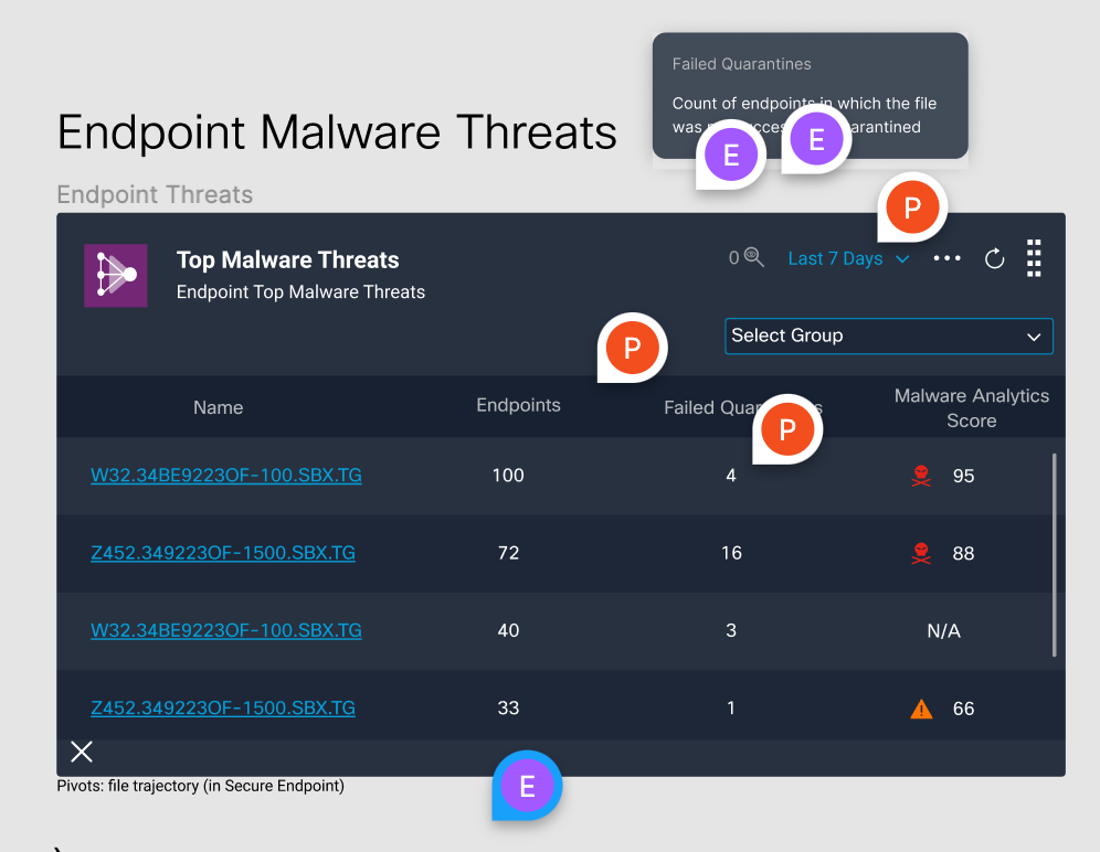 Secure Endpoint’s tiles on the SecureX dashboard showed broad, overarching figures and facts that helped the upper-level management of our customers understand what was going on. However, those figures and facts weren’t actionable, and didn’t help the analysts target individual threats and attacks.