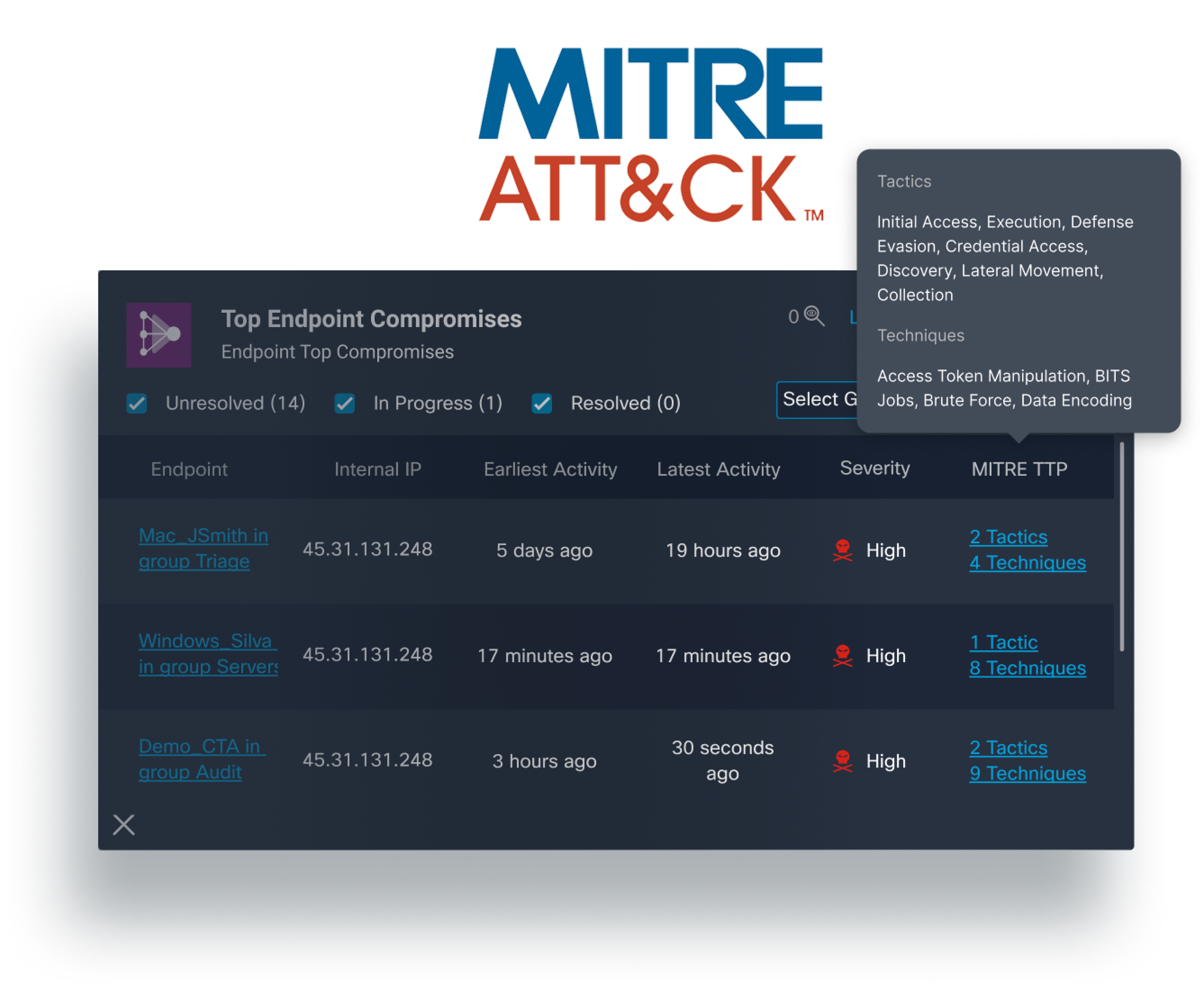 To further enrich the analysts’ experience, we included MITRE Attacks and Tactics information for each endpoint compromise to further inform the severity and type of compromise that occurred.